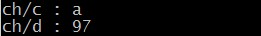 The second output "97" shows the ASCII code for a.