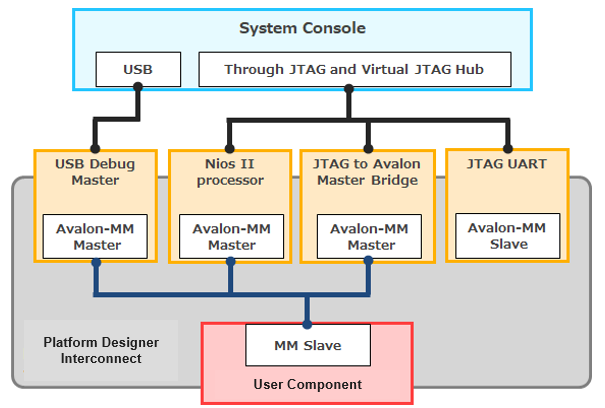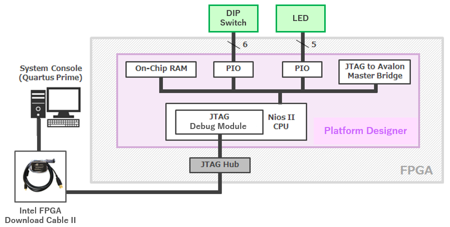 If you only need simple register access, you can debug with Nios II alone, but this time, JTAG to Avalon Master Bridge is also connected to use JTAG Debug service (command).