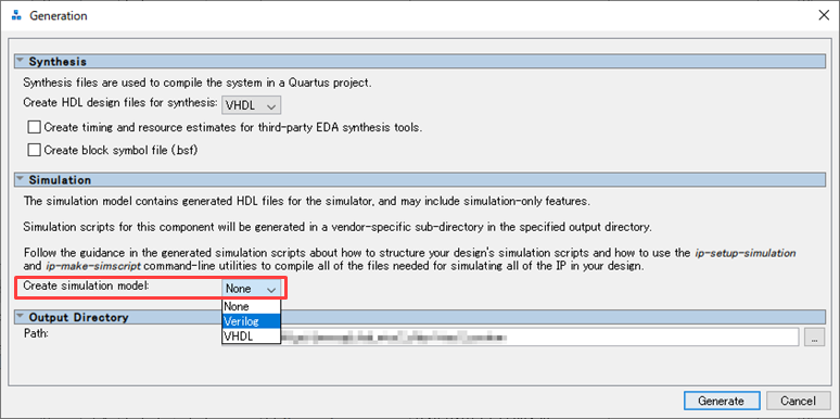 In recent IP, even if the language choice for the simulation model is VHDL, the underlying model is often configured in SystemVeriog, which inevitably requires a simulation library for Verilog HDL. In this case, it is necessary to specify the library for Verilog HDL by using the vsim -L command, so please use Verilog HDL for the Format for output netlist even if the model is generated in VHDL.
