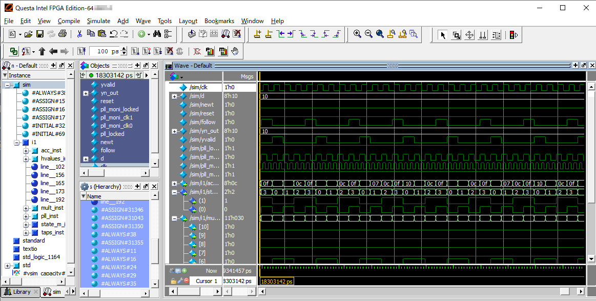 For example, a click on the Quartus Prime menu will automatically <Questa - IFE starts, compiles and loads the simulation, displays the simulation results in the waveform window>, and so on.