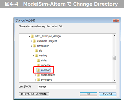Next, launch ModelSim® - Altera® FPGA Edition. Once launched, select ModelSim® - Altera® FPGA Edition's File menu ⇒ Change Directory and choose Example Design Storage Directory ⇒ simulation ⇒ verilog or vhdl ⇒ mentor.