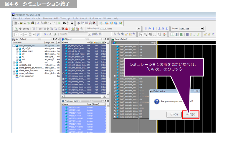 Click No if you want to check the waveforms after the simulation is complete. (Note that clicking Yes will close ModelSim® - Altera® FPGA Edition.)
