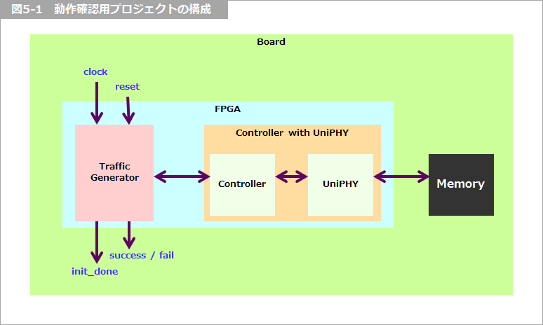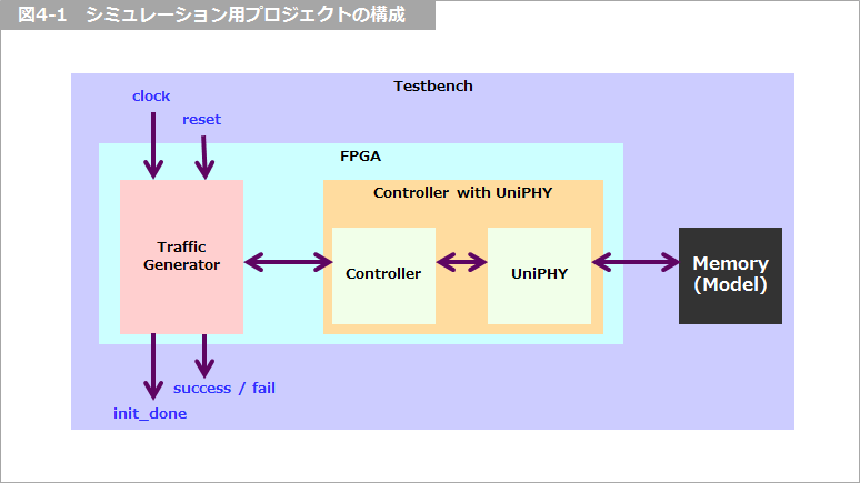 To illustrate the simple operation of the simulation, addresses, commands, and data are sent to the memory controller from the traffic generator, which receives the clock supply, and are written to memory via UniPHY. The data read from memory is then compared to the data written. If the data match, Success = High; if not, Fail = High.