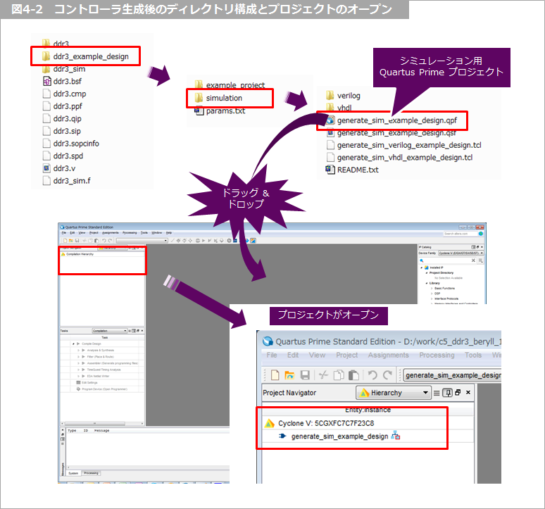 As shown in the figure above, the Quartus® Prime project for simulation has been generated. (You can also drag & drop the QPF file from Windows Explorer onto Quartus® Prime.)