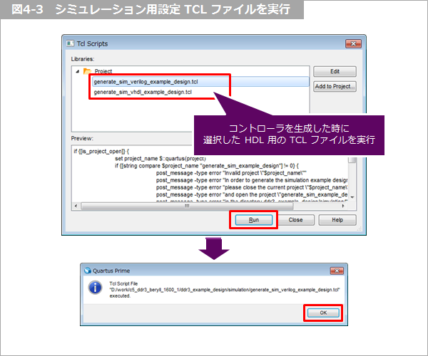 Once the project is open, select Tools menu ⇒ Tcl Scripts in Quartus® Prime, select the simulation configuration TCL file, and click Run to execute it. At this point, select the HDL (Verilog or VHDL) that you chose when generating the controller. When the TCL file is finished running, click Close.