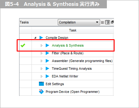 After opening the project for operation check, select Processing menu ⇒ Start ⇒ Start Analysis & Synthesis to execute the logic synthesis. (When the synthesis is successfully completed, Analysis & Synthesis in the Tasks window will change to a green check mark.