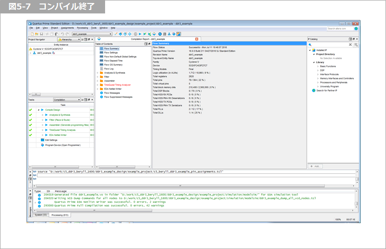 The timing analysis result (TimeQuest Timing Analyzer in the compilation report) is in red. This is due to the fact that timing constraints are not applied to all pins. However, since the unconstrained pins are for reset, JTAG, and LED output, we will proceed as is.