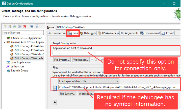For connect only, no download target is specified. This is necessary when the debug target does not have debug symbol information, such as binaryized software. Specify the application before binaryization (optional) when you want to debug while referring to symbolic information such as connection to source code, functions, variables, etc.