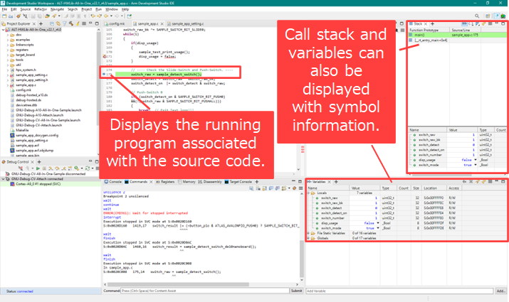 Call stacks and variables are also displayed with symbolic information associated with the source code.