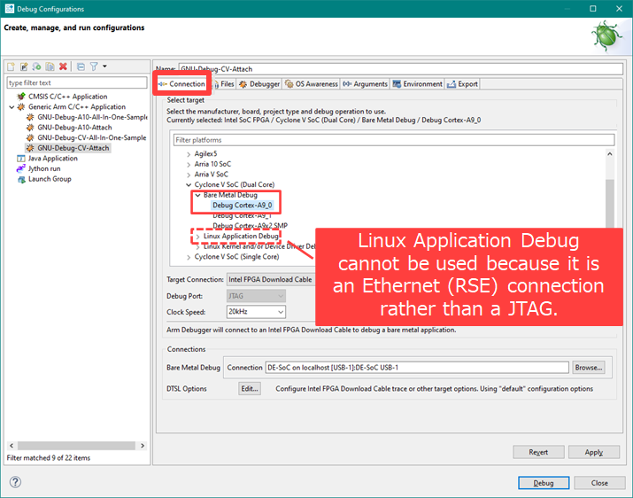 The connection configuration is the same as the normal debug procedure of downloading and executing software from the debugger; Linux® Application Debug is not available due to the Ethernet (RSE) connection instead of JTAG.