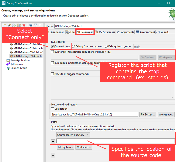 To use Arm® DS / DS-5 as an attach-only device, select the "Connect Only" execution control option on the Debugger tab of the Debug Configuration. Basically, this selection is all that is needed to attach. If you want to display the source code associated with the running program in the debugger, additional settings are required.