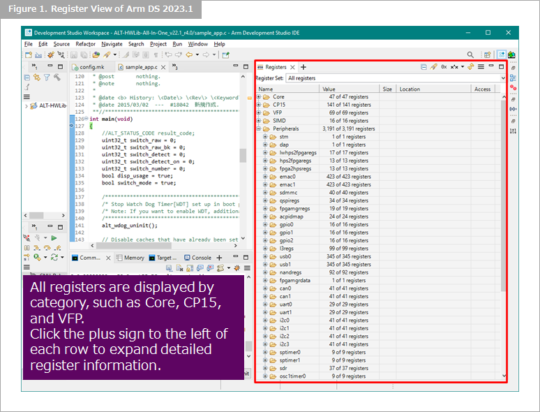 In this article, we have described the settings for displaying the registers predefined in Arm® DS / DS-5.
