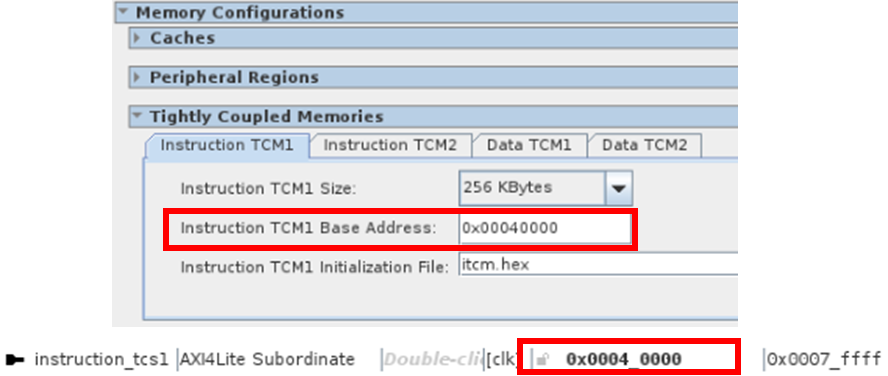 First, configure the Instruction TCM1 tab and Data TCM1 tab of Tightly Coupled Memories from the Memory Configurations block.
