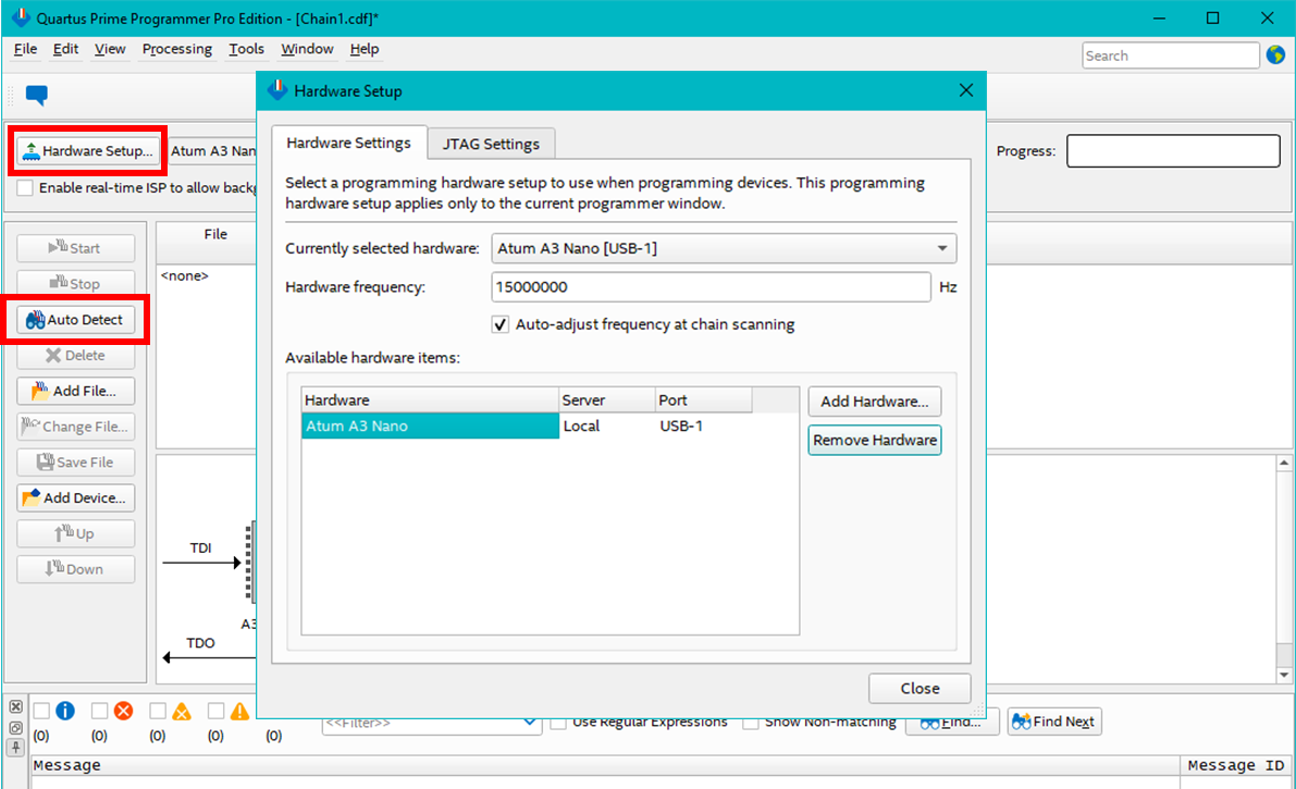 Click the Hardware Setup button to specify the JTAG hardware and clock frequency to be connected. Click the Auto Detect button.