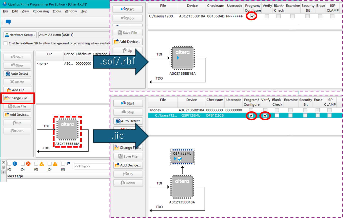 Point: There is a difference in the device displayed when selecting .sof/.rbf for JTAG configuration and when selecting .jic for AS configuration. In the case of writing to Flash, you can also select "Verify" after writing to Flash.