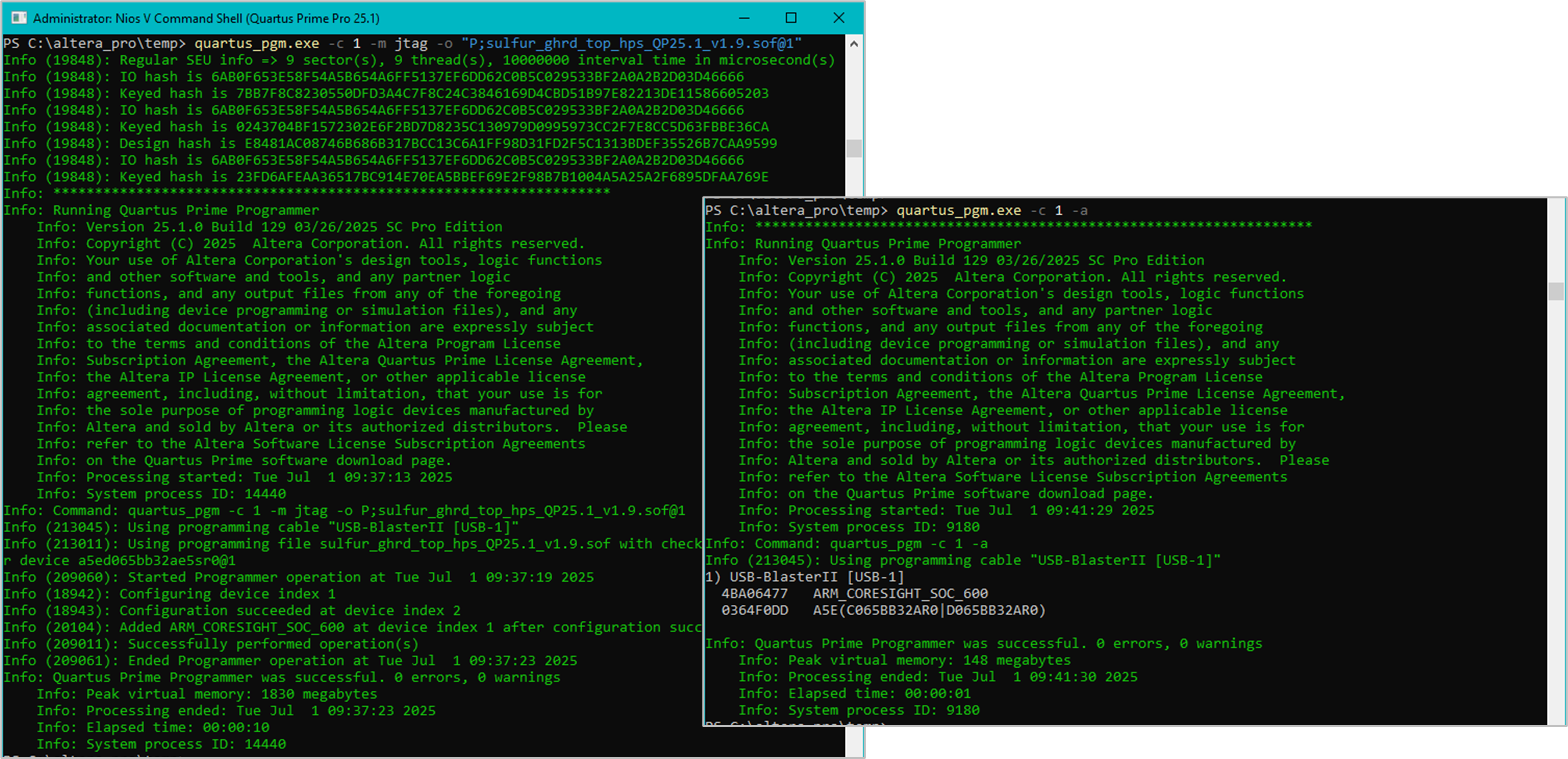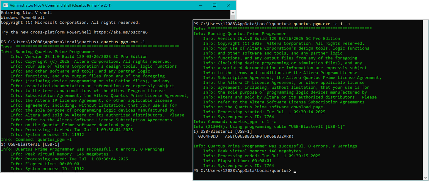 A tool called quartus_pgm is available as a command line version of the Quartus Programmer tool introduced in the first section. This tool is used by entering commands on a terminal with a Quartus Prime path, such as the Nios V Command Shell.