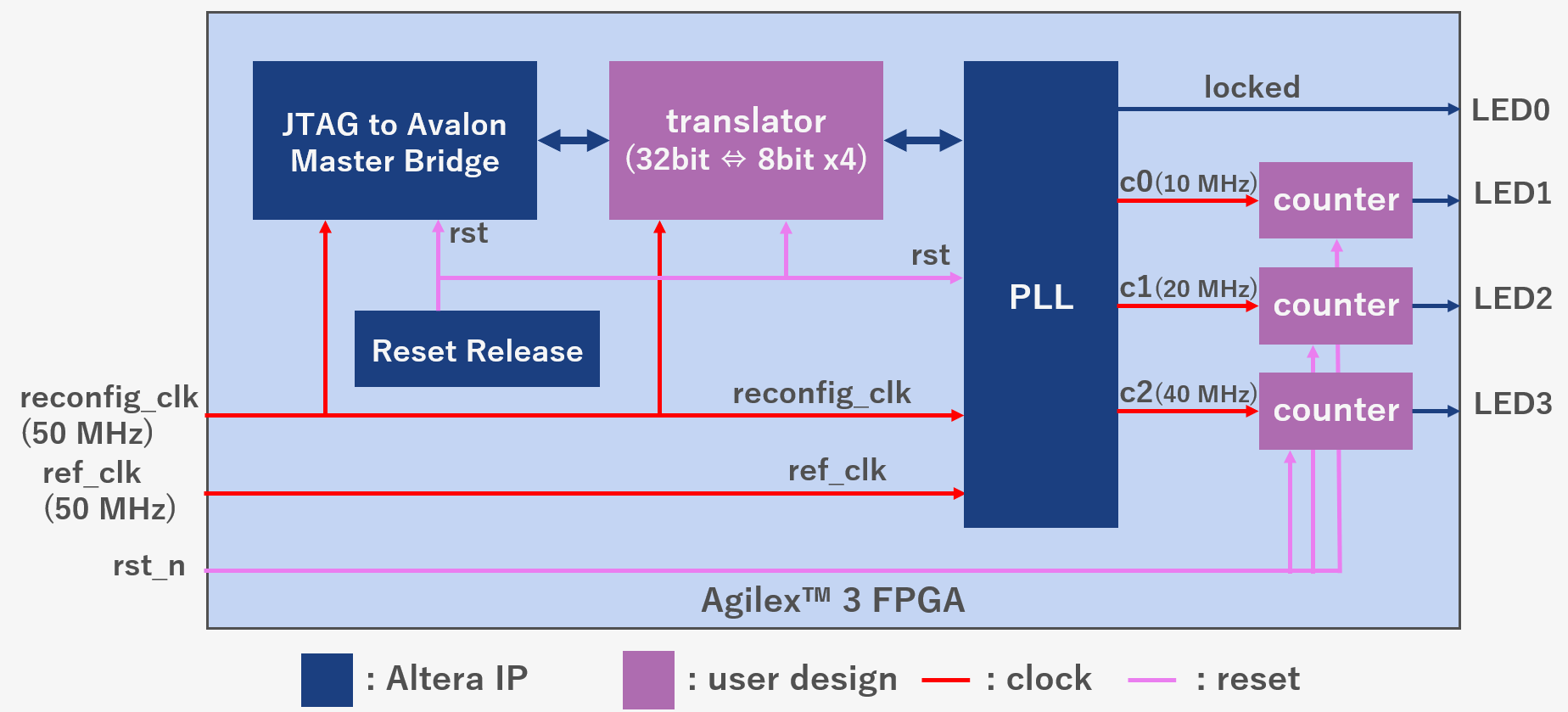 This time, we will use the System Console to set the I/O PLL registers and verify the dynamic reconfiguration operation. The block diagram of the design is shown in Figure 3. The output clock frequency of the PLL is set as C0: 10 MHz, C1: 20 MHz, and C2: 40 MHz. A counter operating at each clock frequency is implemented, and the upper bits of the counter are output to LEDs so that the LED blinking can be checked.