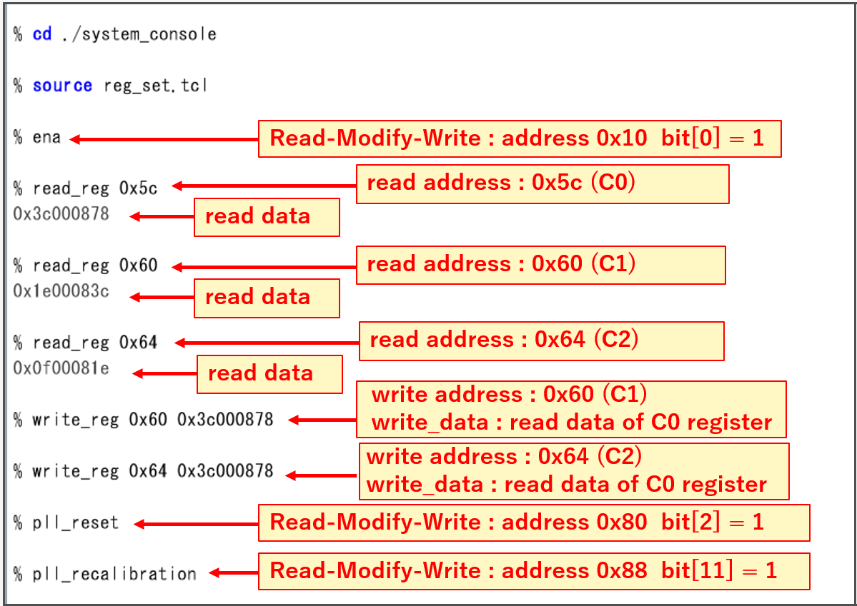 Next, follow the steps described above. This time, we have created a simple Tcl (file name: reg_set.tcl) for accessing each register of the I/O PLL. This Tcl is located in the system_console folder. Type: