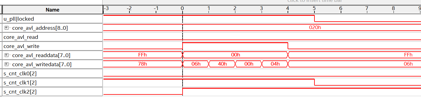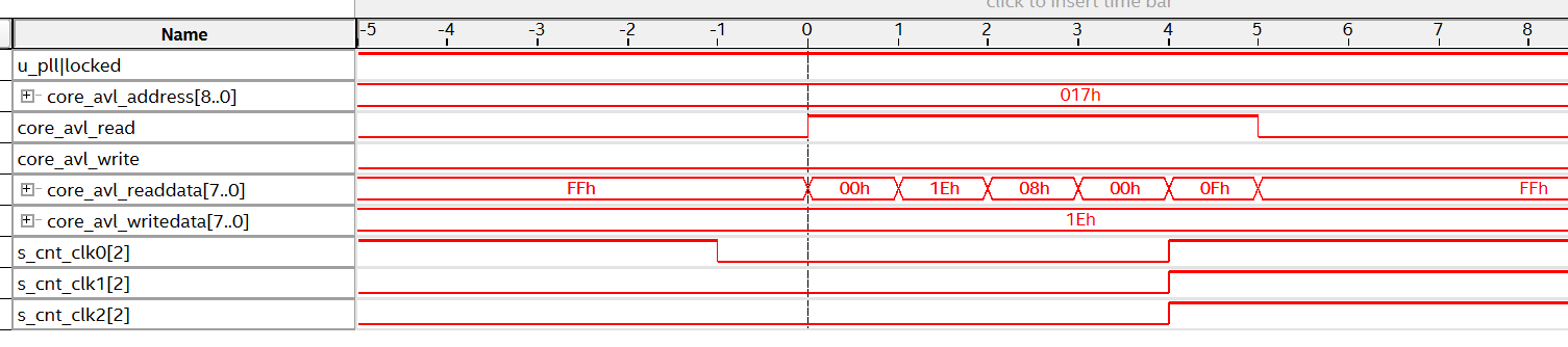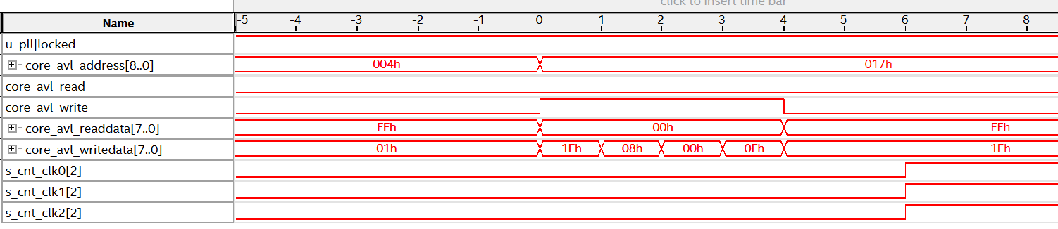 Figure 12 shows the overall waveform of Figure 11. Writing 1 to bit[2] of the Reset PLL register (address 0x80) causes the I/O PLL to enter a reset state, which stops the clock output and therefore also stops the counter. After that, writing 0 to bit[2] releases the reset.