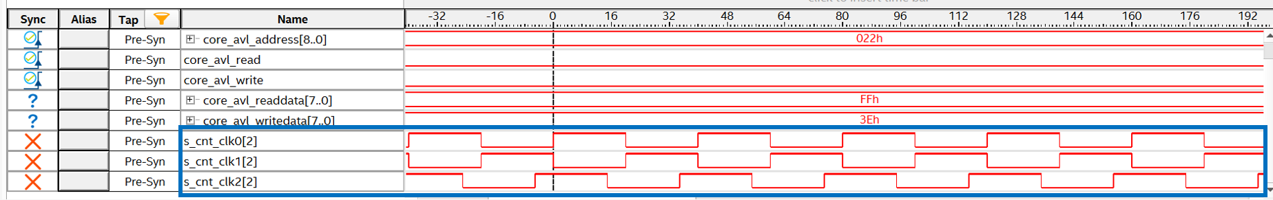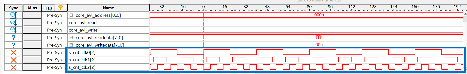 Figure 7 shows the results with the default settings and Figure 8 shows the results after dynamic reconfiguration. The sampling clock is asynchronous to each counter clock, so the waveform is distorted, but you can see that the counter period of C0, C1, and C2 are the same in Figure 8.