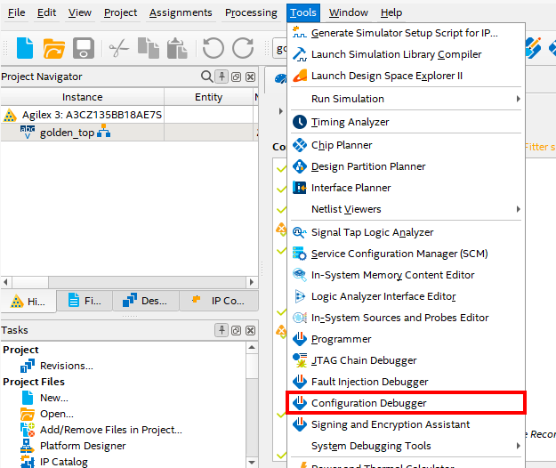 Next, start the Configuration Debugger, which can be started from Tools -> Configuration Debugger in the Quartus® Prime menu bar.
