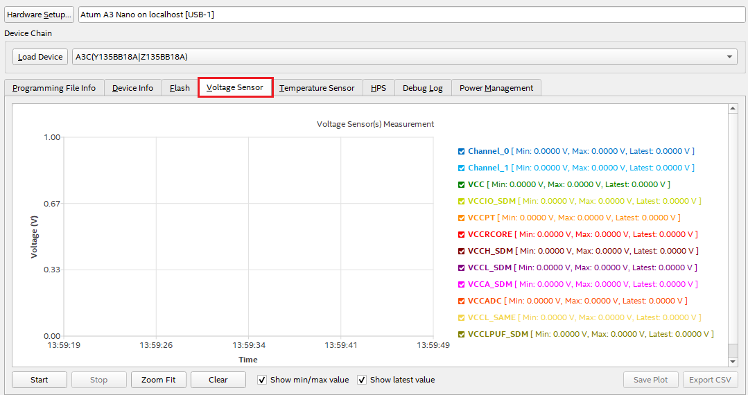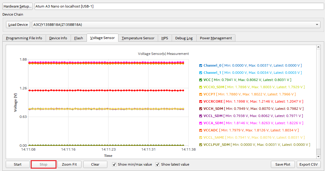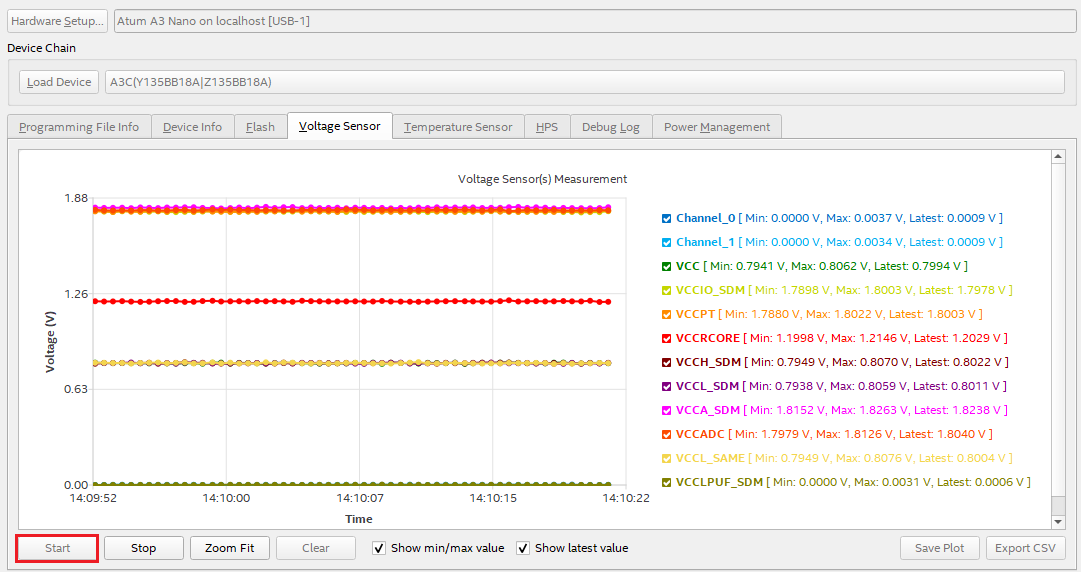 Agilex™ 3 and other SDM-equipped devices (Agilex™ family / Stratix® 10) are equipped with voltage sensors. These sensors can be used to check the voltage of the device.