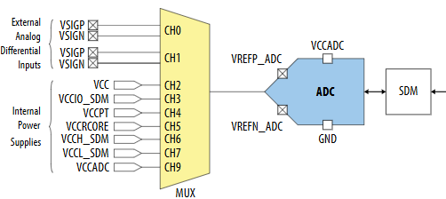 The Agilex™ 3 voltage sensor system incorporates a 7-bit analog-to-digital converter (ADC) capable of sampling up to 1KSPS.