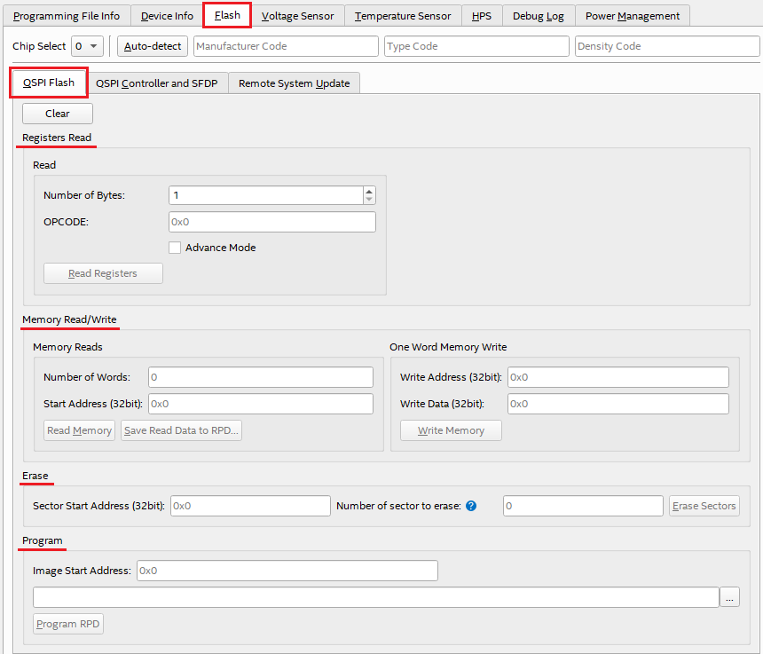 The QSPI Flash tab is used to read/write registers, read/write memory, erase and program.
