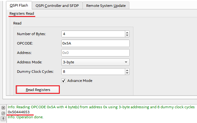 [After clicking the Read Registers button, the SFDP signature, 0x50444653, will appear in the message window.