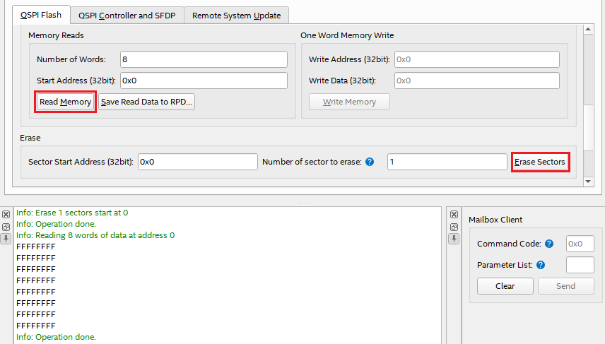 [Figure 10] Sector Erase & Memory Read in the QSPI Flash tab in the Flash tab