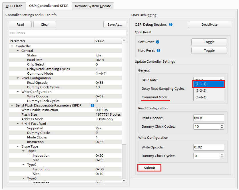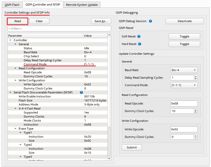 Click the "Read" button in the Controller Settings and SFDP Info section to confirm that the Command Mode has been changed.