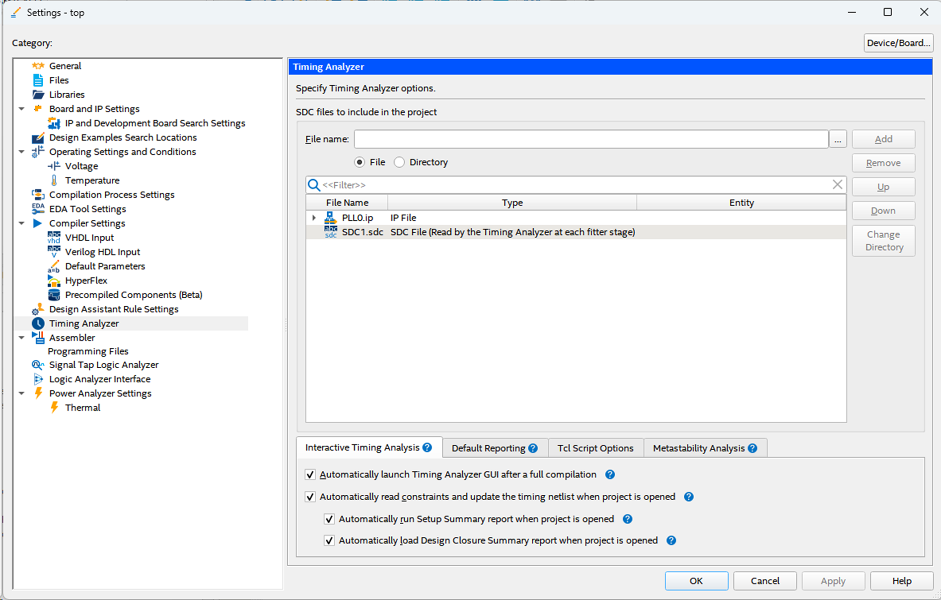 Register the user SDC file and the IP-generated .ip file created on the following screen in the Assignment menu > Settings.