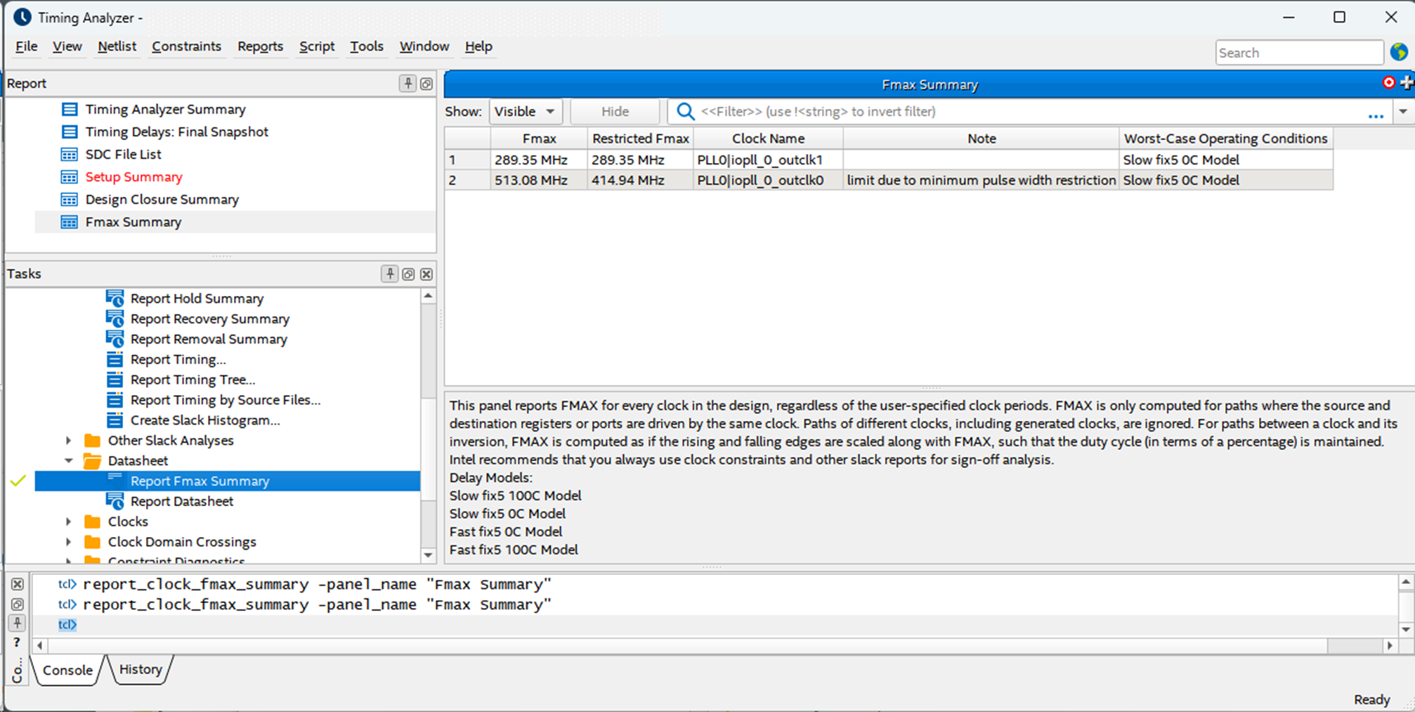Next, Fmax can be found in the Datasheet folder in the Tasks pane > Report Fmax Summary.