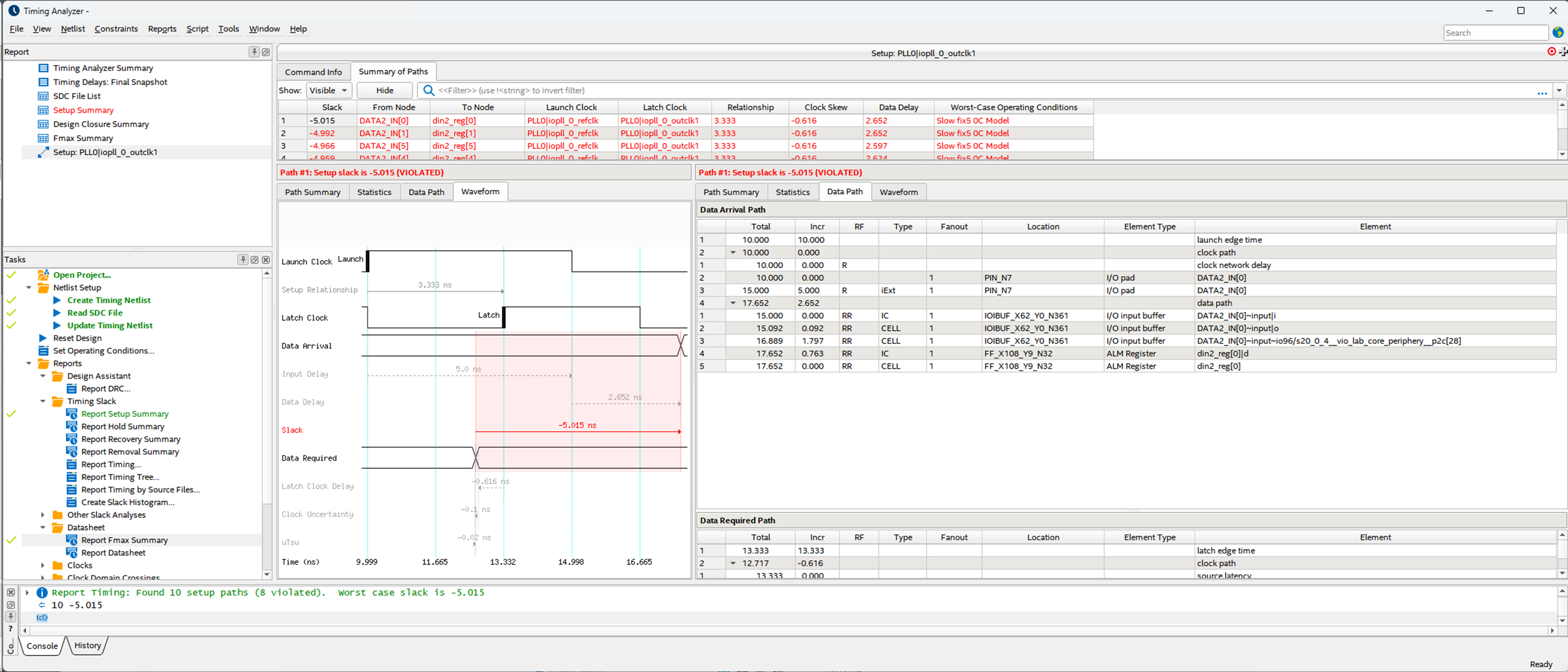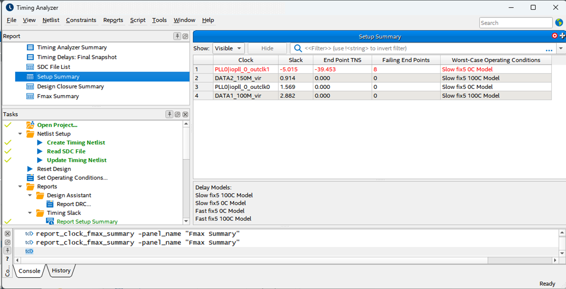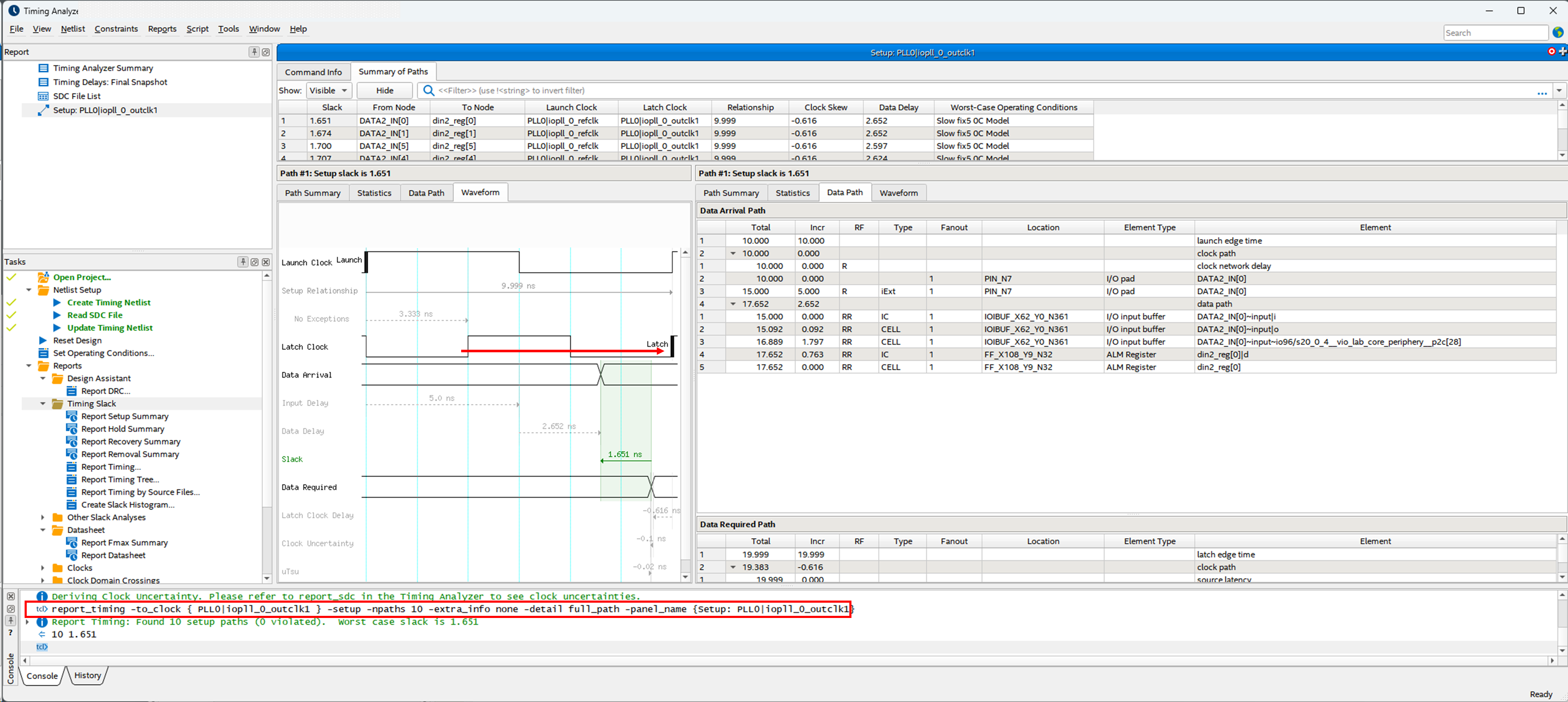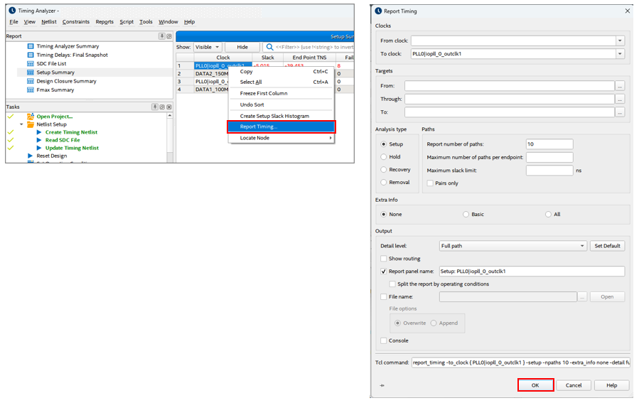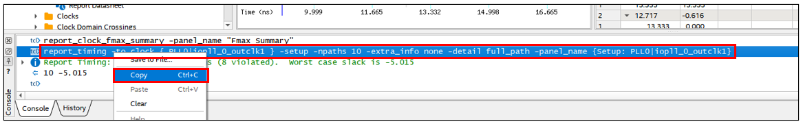 Return to the Timing Analyzer and copy the Report Timing command that appears in the Console pane.