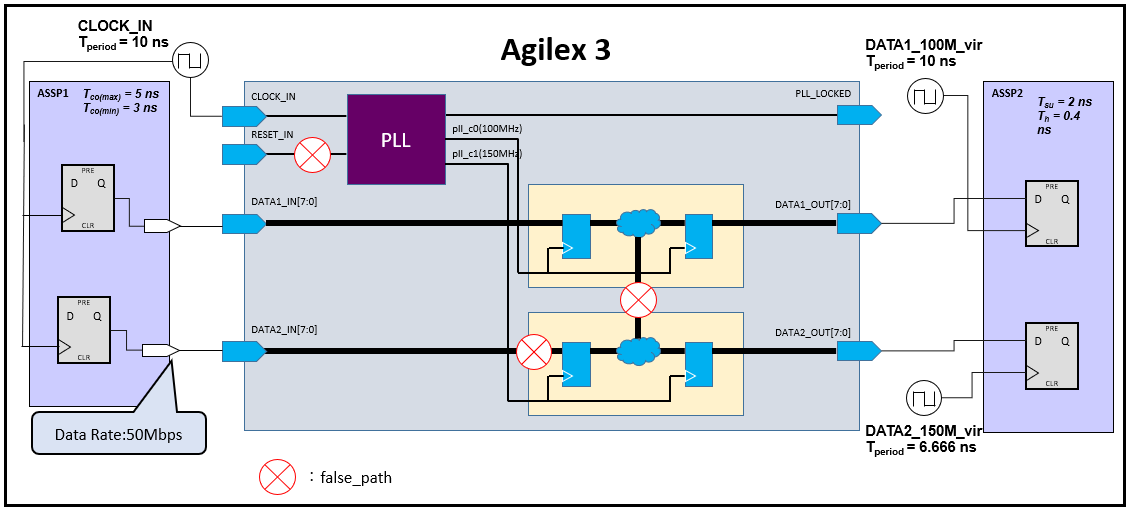 This error is a DATA2_IN (input port)->din2_reg (first stage FF) error between the different clocks of CLOCK_IN (100MHz) driving the transmitter device and c1 (150MHz) at the PLL output, and since the data rate of the transmitter device is very slow at 50Mbps Since the data rate of the transmitting device is very slow (less than 50Mbps), it is assumed that the system specification allows latching after the 1st edge.