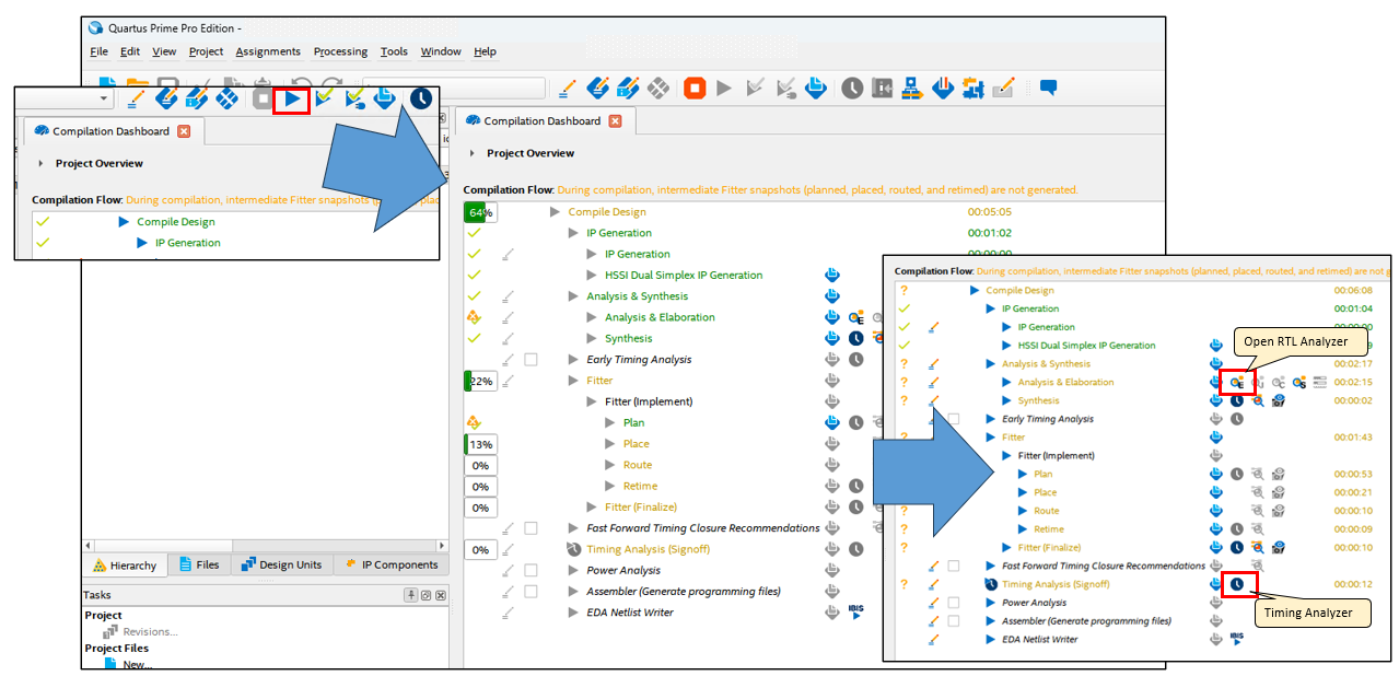 Once compiled, the RTL Analyzer can be checked and the Timing Analyzer analysis is enabled.