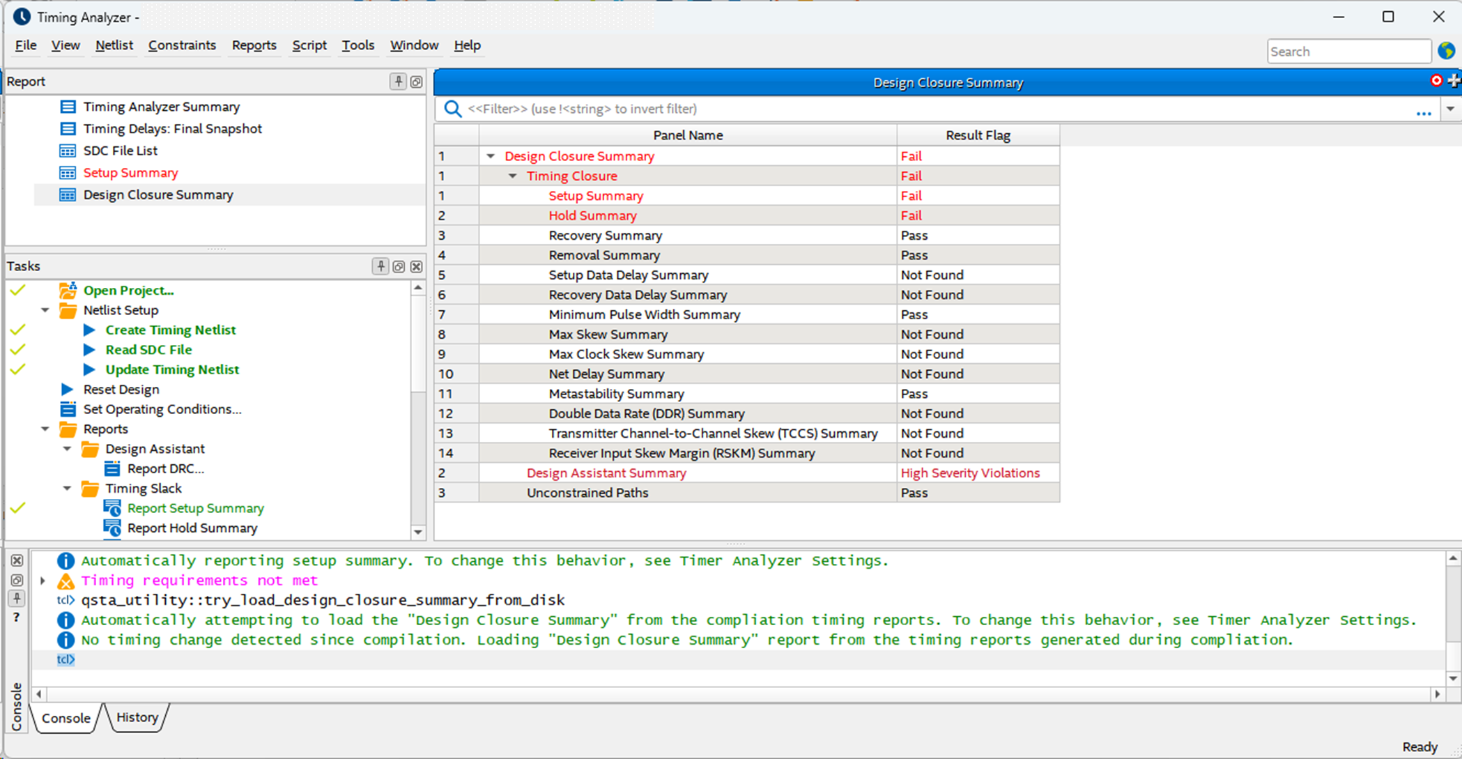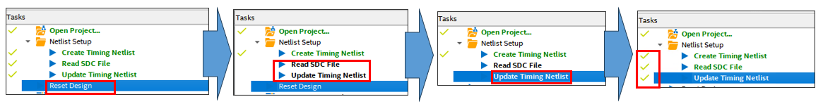 In the Tasks pane, click Reset Design, the Read SDC and Update Timing Netlist will change from green to black, and the green check mark will disappear. Now the latest SDC is reflected in the Timing Netlist since the last compilation.