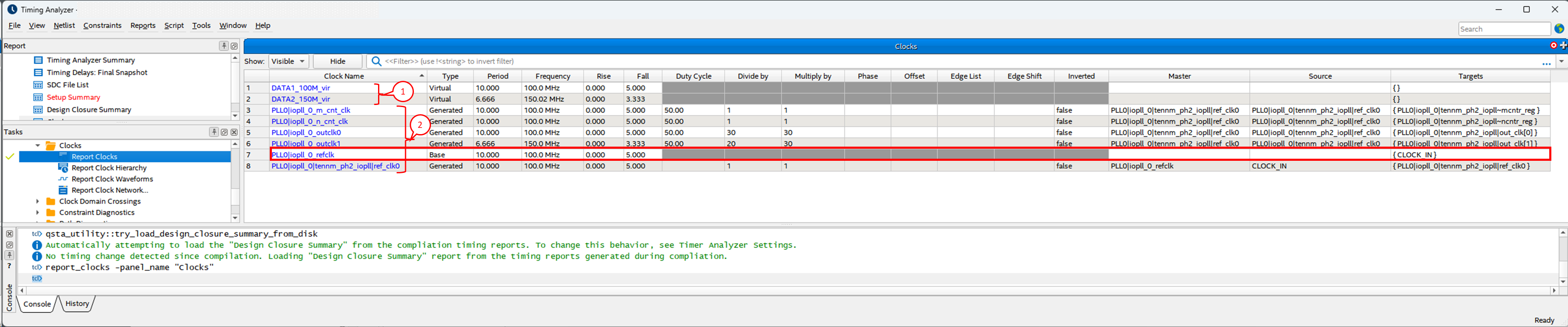 Click the Clocks folder > Report Clocks in the Tasks pane to see the currently defined clock constraints.