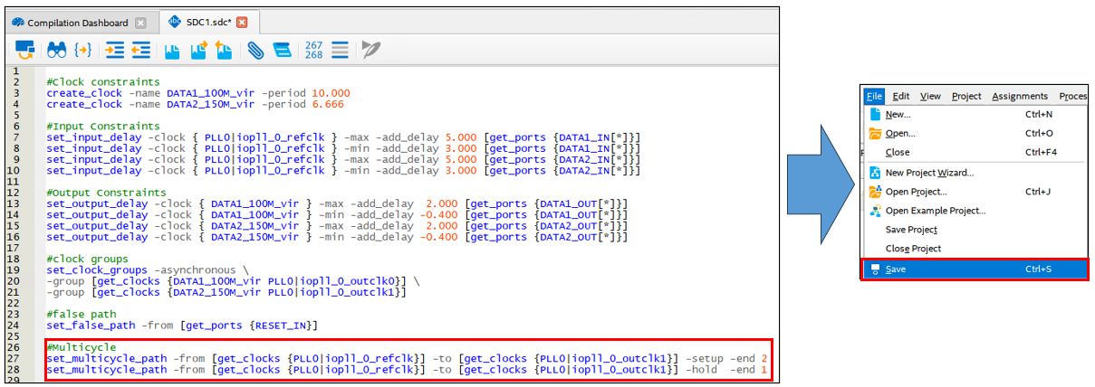 Add the copied SDC to the user SDC (SDC1.sdc), copy and edit the SDC, add the -hold SDC, and overwrite and save.