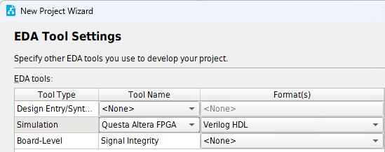 Specify Questa Altera FPGA Edition as the Simulation tool and Verilog as the HDL language.