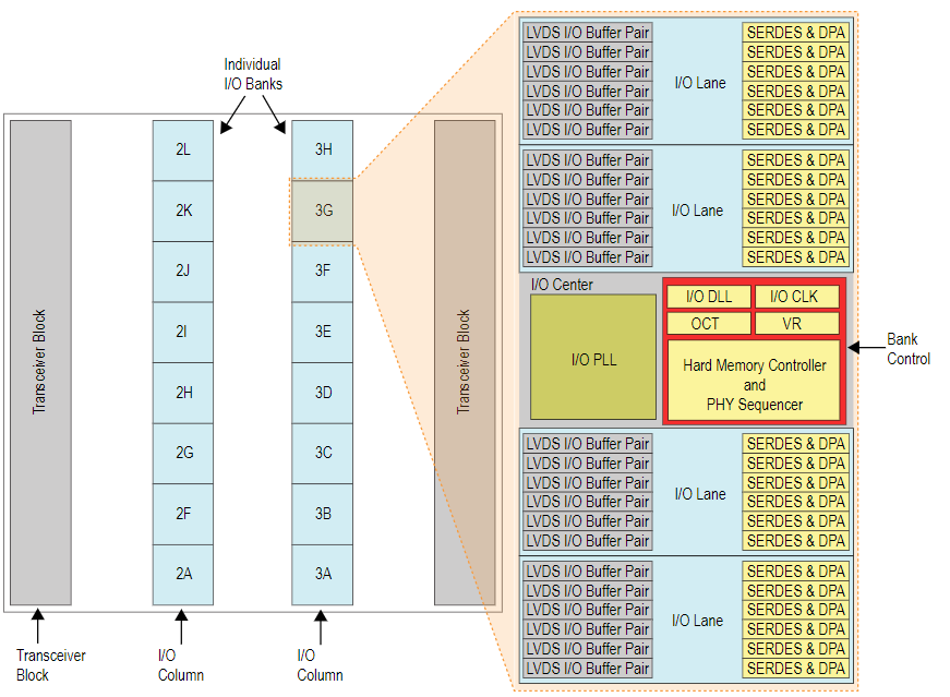 The Intel® Arria® 10 FPGA device has two I/O Columns with one hard memory controller implemented in each I/O Bank, as shown in the figure below.