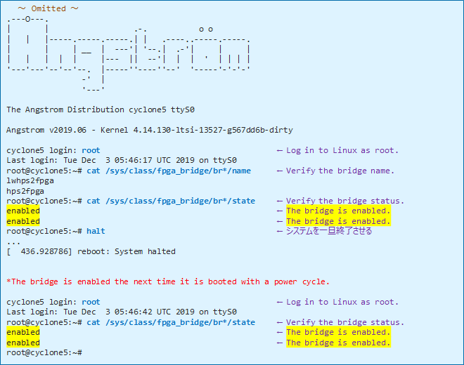# cat /sys/class/fpga_bridge/br*/state ← Check the bridge status
