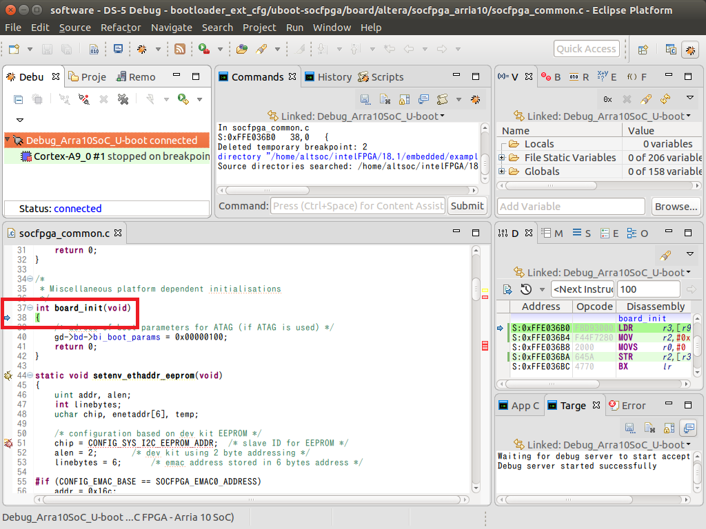 When the connection is successfully completed, the program stops at a breakpoint near the beginning of function: board_init.