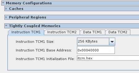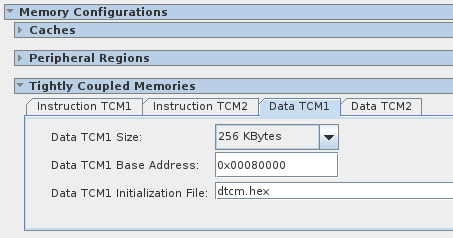 まず、Memory Configurations ブロックより Tightly Coupled Memories の Instruction TCM1 タブと Data TCM1 タブの設定を行います。