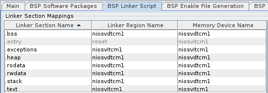 Linker Script の設定は、BSP Editor から BSP Linker Script タブを選択し、.text および .exceptions に Instruction TCM1(niosvitcm1)を設定し、残りの Linker Section Name に Data TCM1(niosvdtcm1)を設定します。