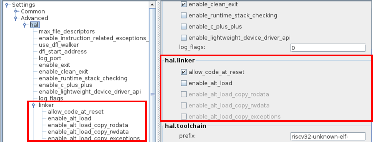 hal.linker の設定は Main タブにある Settings → Advanced → hal の項目で、hal.linker オプションを allow_code_at_reset のみを有効にします。