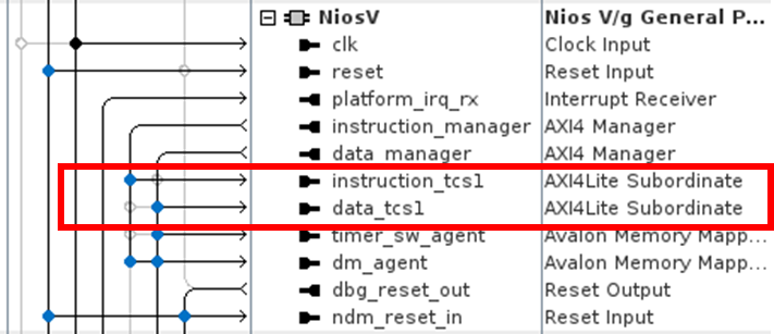 各 TCM の設定後、Platform Designer の System View 内の Nios® V プロセッサーを確認してみると、下記赤枠の ポートが増えています。これらが TCM とのインターフェイスとなりますので、下図のとおり Nios® V の instruction_manager と data_manager を接続してください。
