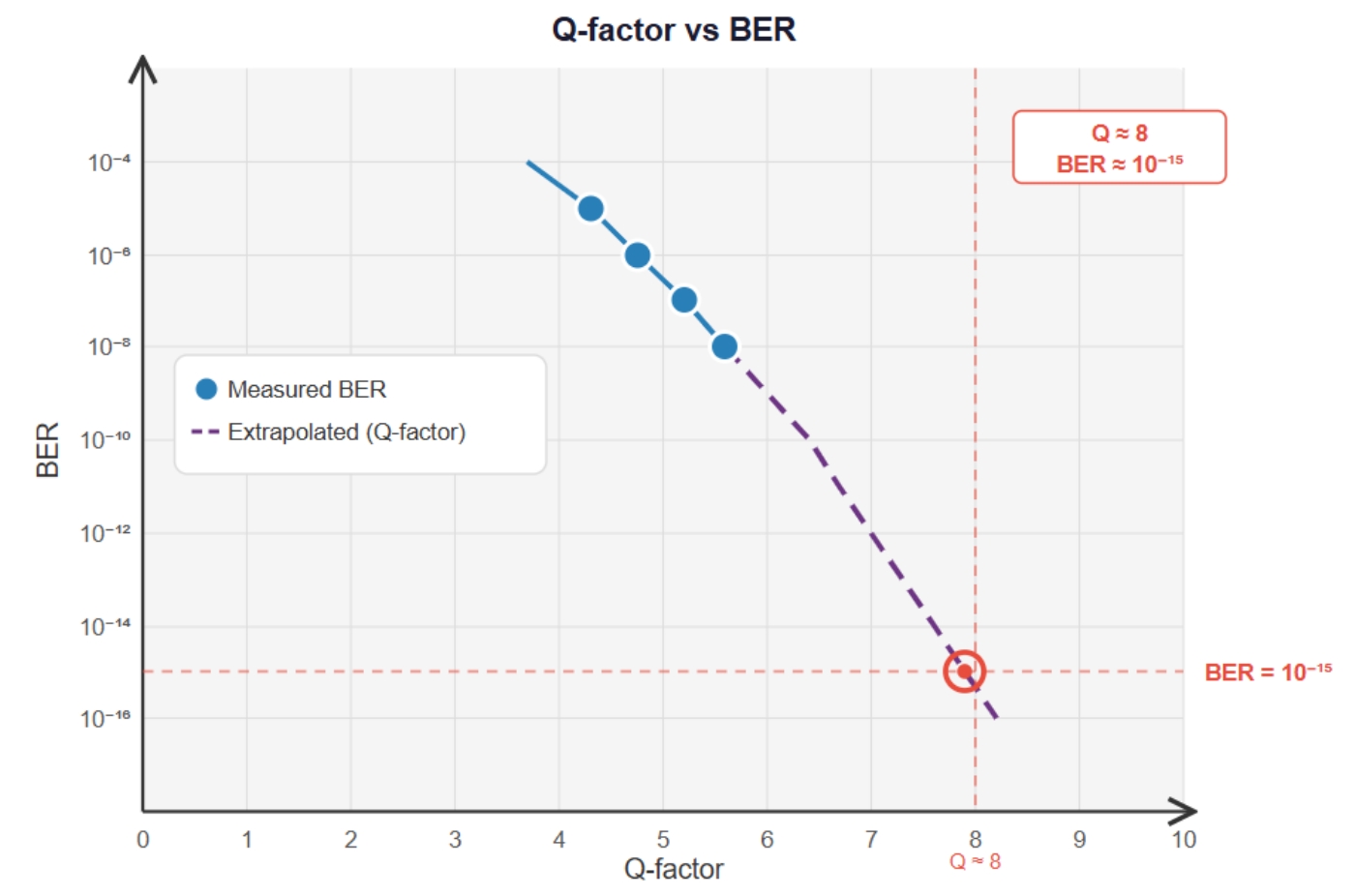 BER と Q-factor の間には erfc(相補誤差関数)による対応関係があり、対数グラフ上でほぼ直線に並ぶ性質があります。 この性質を利用して、比較的浅い BER(10⁻⁶ ~ 10⁻⁸ 程度)の実測点から直線を延長(外挿)することで、10⁻¹⁵ 付近の深い BER を推定できます。 下のグラフでは、Q ≈ 8 のとき BER ≈ 10⁻¹⁵ に対応することが確認できます。