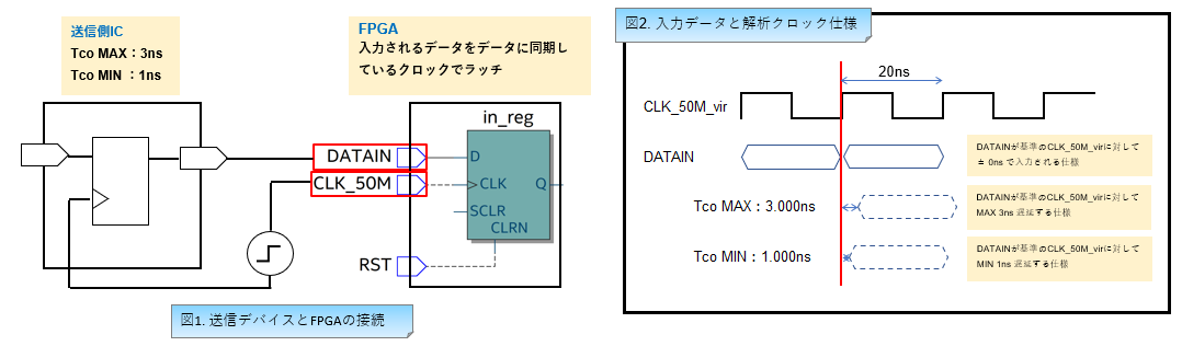この例では、下図のようなシステム接続の場合に、FPGA の DATAIN_50M の Port をTarget としたset_input_delay の例を紹介します。